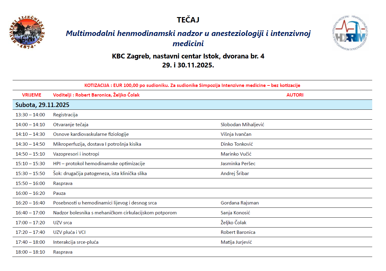 FINALNI PROGRAM – Tečaj Multimodalni hemodinamski nadzor u anesteziologiji i inzenzivnoj medicini